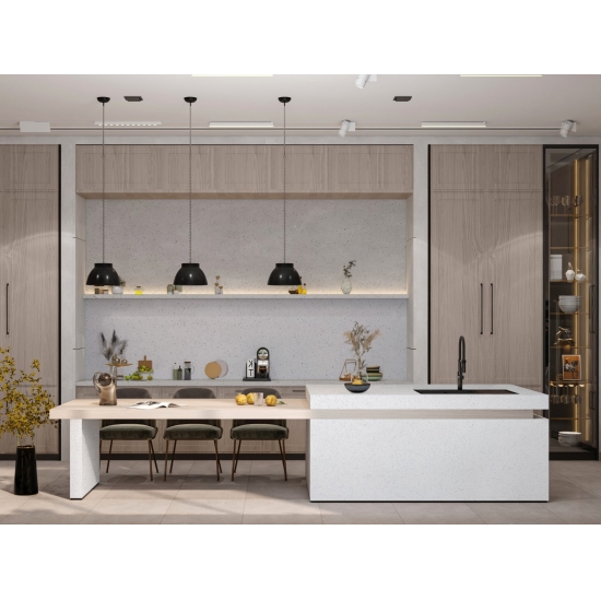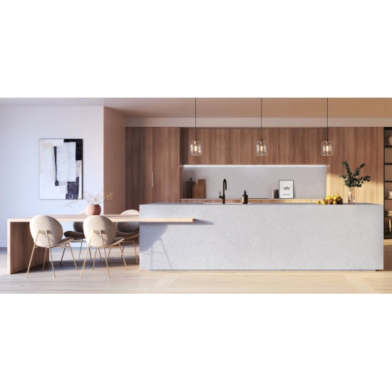 1001 スパークルホワイトクォーツ 鮮やかな白色のベースにきらめく鉱物の粒が繊細に織り交ぜられ、清らかで輝く外観を呈しています。繊細なきらめきがあらゆる角度から光を捉え、表面は優雅さを放ち、深みと洗練された雰囲気を添えます。このクォーツは、あらゆる空間を清潔で洗練された印象に仕上げ、モダンなカウンタートップ、洗面台、そしてアクセントとなる表面に最適です。
