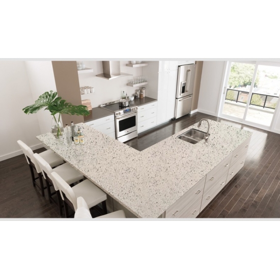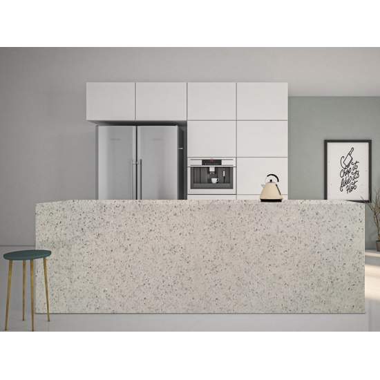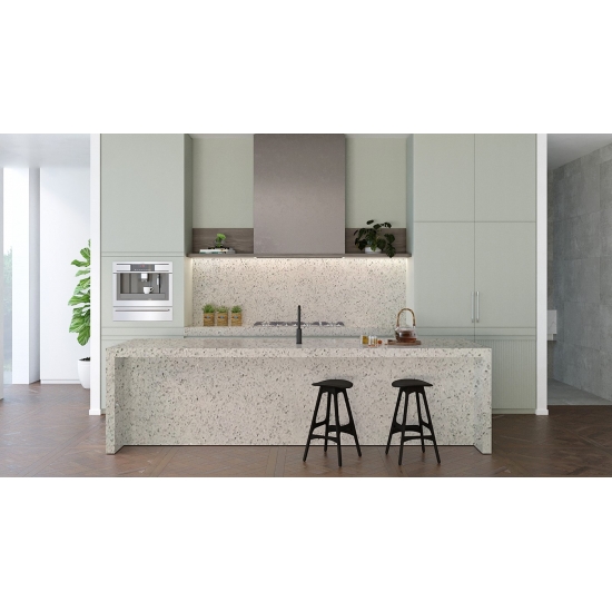スパークルクォーツ グレーギャラクシーライトは、他のシリーズとは異なり、より輝く外観を持つ特殊加工を施した人工石英です。壁、床、カウンタートップなどに設置することで、奥行きと質感を与えます。バスルームやキッチンの壁面装飾や洗面台のバックスプラッシュなどにご使用いただけます。無菌性と耐湿性を備えているため、湿気の多い場所にも最適です。