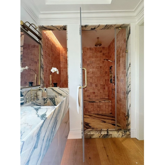 ポルトガル オンドゥラーレ ロッソ マーブル もっている 独特の低彩度スモーキーピンクの色合い。繊細に織り込まれたテクスチャーは、果てしない銀河を優しく撫でる夕焼けの残光を彷彿とさせます。繊細でありながら精巧で、一本一本の線が自然と夢の調和のとれた共存の物語を語りかけます。