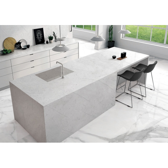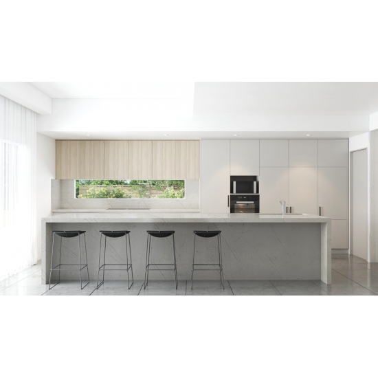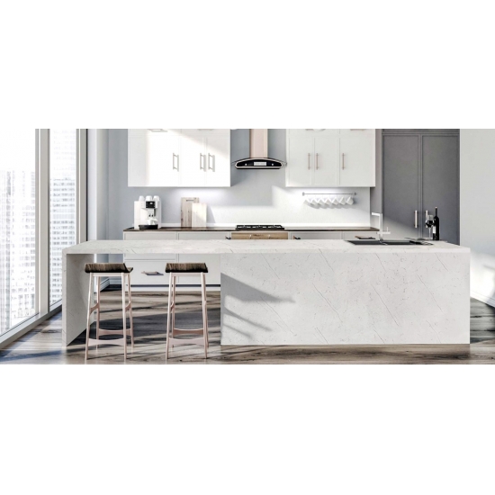 4005 ビアンカ ヴェーノ 大理石水晶板 柔らかなホワイトの背景に、繊細で流れるようなグレーの縞模様がアクセントとなり、洗練されたエレガントな美しさを放ちます。大理石を思わせる繊細な模様が、躍動感と自然な調和を生み出し、クリーンでありながら高級感のある印象を与えます。時代を超えた洗練さを醸し出すこのクォーツは、シンプルさと個性を絶妙に調和させ、明るく優雅で高級感のある仕上がりで、モダンなインテリアにもクラシックなインテリアにも最適です。