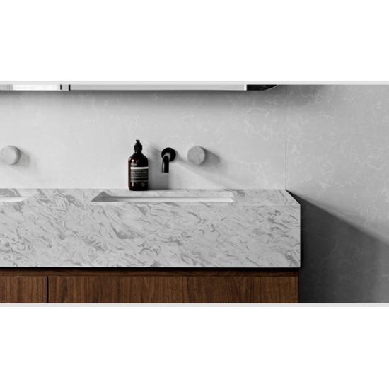 4015 ビアンコ リバー マーブル クォーツ 柔らかな白を基調に、繊細で流れるようなグレーの脈がアクセントとなり、穏やかでエレガントな外観を呈しています。表面は洗練された雰囲気を醸し出し、穏やかな脈が自然な動きと深みを与え、落ち着きと洗練された雰囲気を醸し出します。このクォーツは、あらゆる空間を格上げするデザインで、モダンなインテリアにもクラシックなインテリアにもシームレスに溶け込む、時代を超越した美しさを放ちます。
