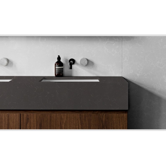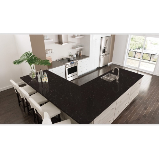 4017 ビアンコ マルキーナ マーブル クォーツ 鮮やかでエレガントな外観を特徴とするクォーツスラブは、鮮やかな白地に、大胆でドラマチックな黒の美しい縞模様が織りなしています。表面は洗練された雰囲気を放ち、コントラストを成す黒の縞模様が奥行きと自然な動きを生み出しています。このクォーツスラブは、洗練された存在感を放ち、時代を超越したエレガンスと、どんな空間にも高級感を添えます。