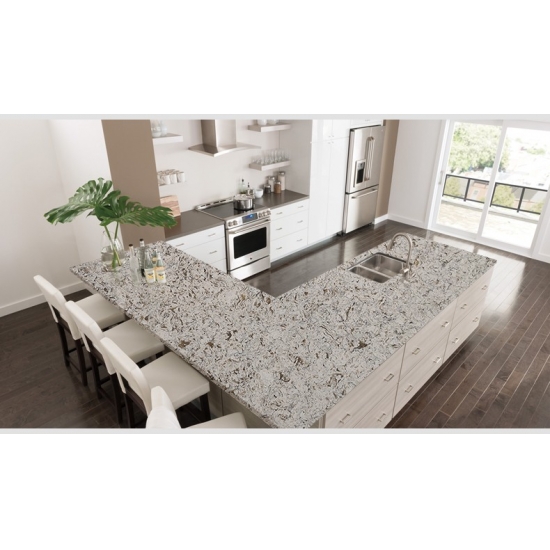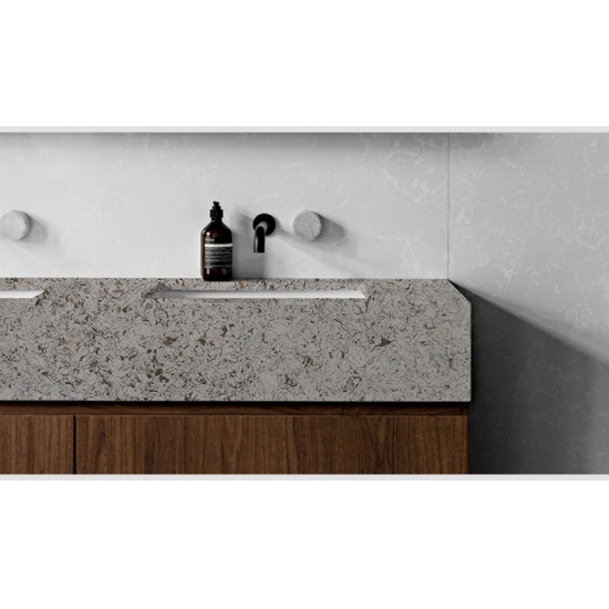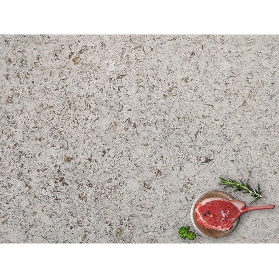 4026 ベージュリバーマーブルクォーツ 温かみのあるエレガントなベージュのベースに、柔らかなクリーム色と繊細なトープトーンの流れるような縞模様がアクセントを添えています。表面は自然な洗練さを醸し出し、穏やかな川床を思わせる柔らかな縞模様が動きと奥行きを感じさせます。このクォーツスラブは、どんな空間にも時代を超越した美しさと控えめな高級感をもたらし、設置場所を問わず洗練された居心地の良い雰囲気を演出します。