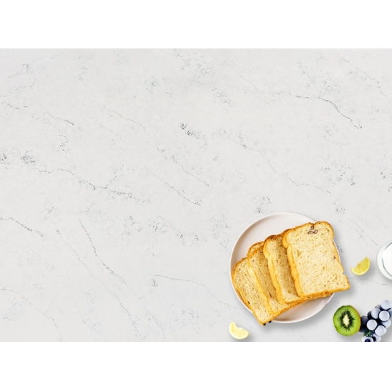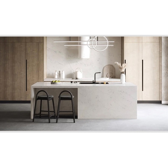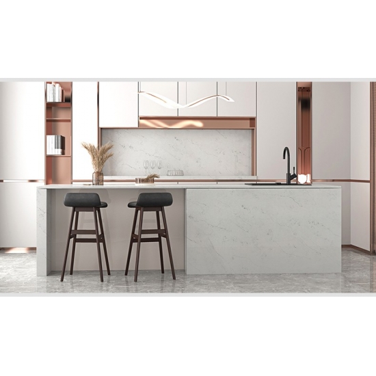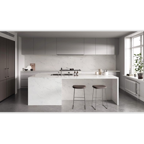 4038 カラーラ彫像用大理石クォーツ 洗練されたエレガントな外観を特徴とする、柔らかなホワイトを背景に、天然の彫像用大理石に着想を得た優美なグレーの縞模様がアクセントになっています。繊細な縞模様がスラブ全体に自然に流れ、動きと奥行き感を演出する表面は、時代を超えた洗練さを醸し出します。このクォーツは、あらゆる空間に明るく贅沢な雰囲気をもたらすように設計されており、キッチン、バスルーム、高級住宅や商業施設のインテリアに最適です。