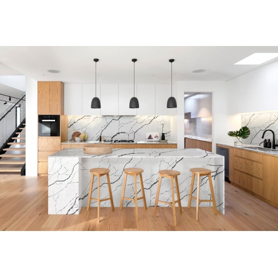 5044 Volakas ホワイトカラカッタクォーツは、時代を超越したエレガンスと汎用性の高いデザインにより、様々な用途に最適です。この研磨仕上げのクォーツは、キッチンカウンター、バスルームの洗面台、バックスプラッシュなどによく使用され、清潔感のある白い表面に柔らかなグレーの縞模様が洗練された雰囲気を添えます。また、住宅および商業施設の壁材や床材にも最適です。