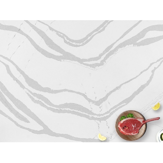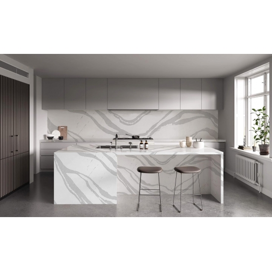5044 Volakas ホワイトカラカッタクォーツは、時代を超越したエレガンスと汎用性の高いデザインにより、様々な用途に最適です。この研磨仕上げのクォーツは、キッチンカウンター、バスルームの洗面台、バックスプラッシュなどによく使用され、清潔感のある白い表面に柔らかなグレーの縞模様が洗練された雰囲気を添えます。また、住宅および商業施設の壁材や床材にも最適です。