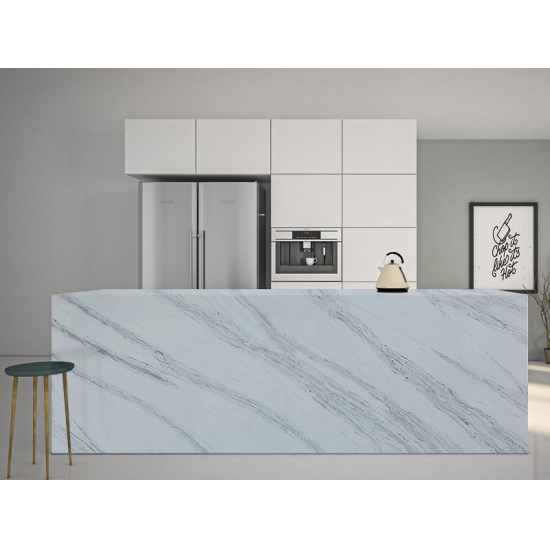 5044 Volakas ホワイトカラカッタクォーツは、時代を超越したエレガンスと汎用性の高いデザインにより、様々な用途に最適です。この研磨仕上げのクォーツは、キッチンカウンター、バスルームの洗面台、バックスプラッシュなどによく使用され、清潔感のある白い表面に柔らかなグレーの縞模様が洗練された雰囲気を添えます。また、住宅および商業施設の壁材や床材にも最適です。