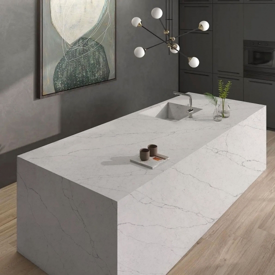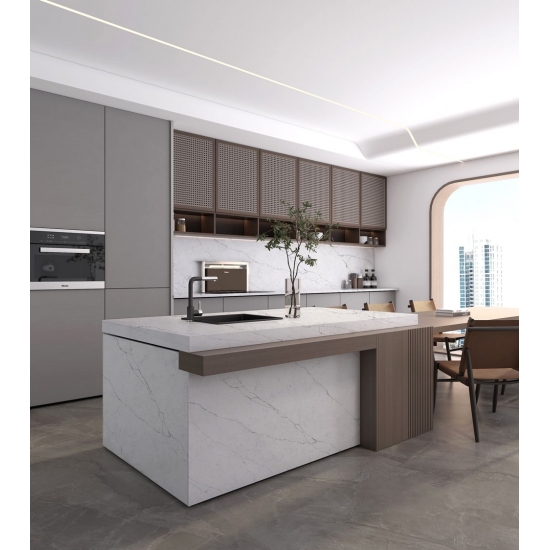 カラカッタシリーズのクォーツは、現在最も人気のあるクォーツストーン製品です。精巧でユニークなカラカッタクォーツは、その澄んだ白と、印象的な大理石のような縞模様で、五感を魅了します。美しく印象的な幅広の縞模様と高級感のある質感。このクォーツは、カラカッタ大理石の自然な外観を備えながら、大理石のワークトップにありがちな欠点を一切備えていません。カラカッタクォーツは非常に耐久性があり、汚れや傷に強いため、キッチンやバスルームのカウンタートップ、階段、窓枠、特注家具、内装、外壁、床、ウォータージェットパターン、その他のデザインプロジェクトにも非常に実用的な選択肢です
