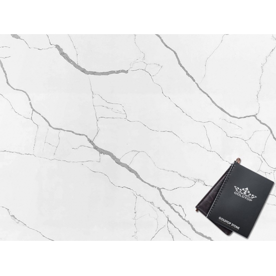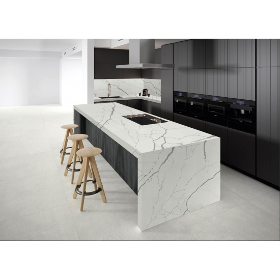 5044 Volakas ホワイトカラカッタクォーツは、時代を超越したエレガンスと汎用性の高いデザインにより、様々な用途に最適です。この研磨仕上げのクォーツは、キッチンカウンター、バスルームの洗面台、バックスプラッシュなどによく使用され、清潔感のある白い表面に柔らかなグレーの縞模様が洗練された雰囲気を添えます。また、住宅および商業施設の壁材や床材にも最適です。