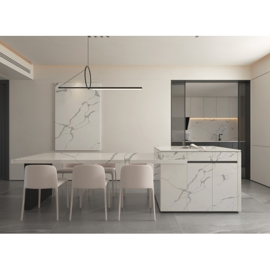 カラカッタクォーツは天然成分から作られていますが、強度と耐久性に優れ、気孔率が低いため、クォーツ製の石製品は実質的に摩耗しません。耐久性、快適性、そして均一な模様が、クォーツストーンの人気が高まっている主な理由です。クォーツストーンは90%が天然石で、残りは石の技術的特性を向上させる接着剤、染料、添加剤です。透水性と耐汚染性は、クォーツストーンの美しさをさらに引き立てます。