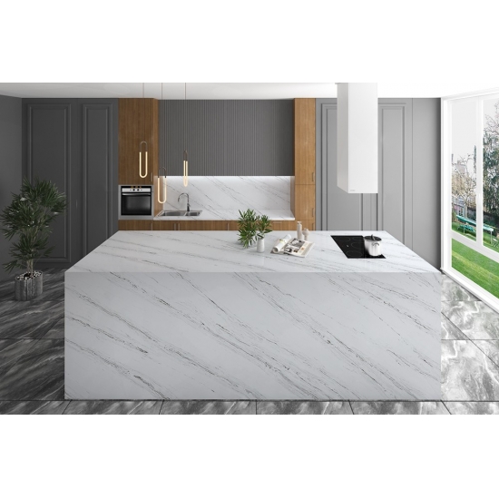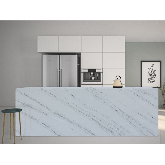 5044 Volakas ホワイトカラカッタクォーツは、時代を超越したエレガンスと汎用性の高いデザインにより、様々な用途に最適です。この研磨仕上げのクォーツは、キッチンカウンター、バスルームの洗面台、バックスプラッシュなどによく使用され、清潔感のある白い表面に柔らかなグレーの縞模様が洗練された雰囲気を添えます。また、住宅および商業施設の壁材や床材にも最適です。
