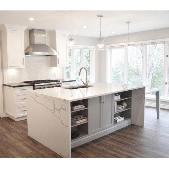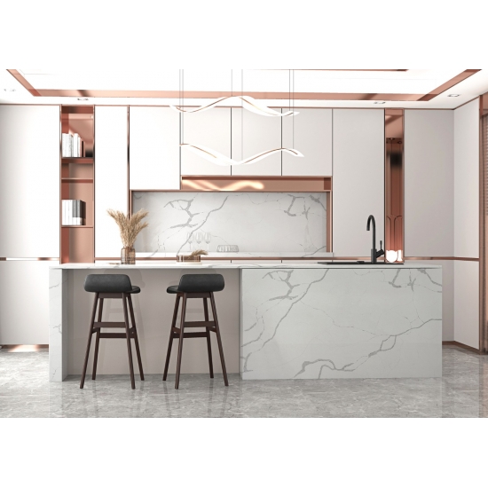 カラカッタシリーズのクォーツは、現在最も人気のあるクォーツストーン製品です。精巧でユニークなカラカッタクォーツは、その澄んだ白と、大理石のような印象的な縞模様が五感を魅了します。美しく印象的な幅広の縞模様と高級感のある質感が特徴です。カラカッタ大理石の自然な外観を保ちながら、大理石のワークトップにありがちな欠点は一切ありません。カラカッタクォーツは、汚れや傷に強い耐久性の高いワークトップです。キッチンやバスルームのカウンタートップ、階段、窓枠、カスタム家具、内装、外壁、床、ウォータージェット模様、その他のデザインプロジェクトなど、実用性も兼ね備えています。