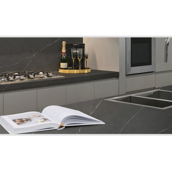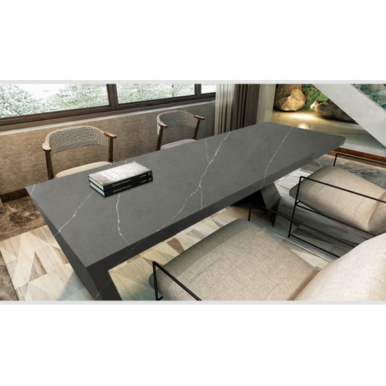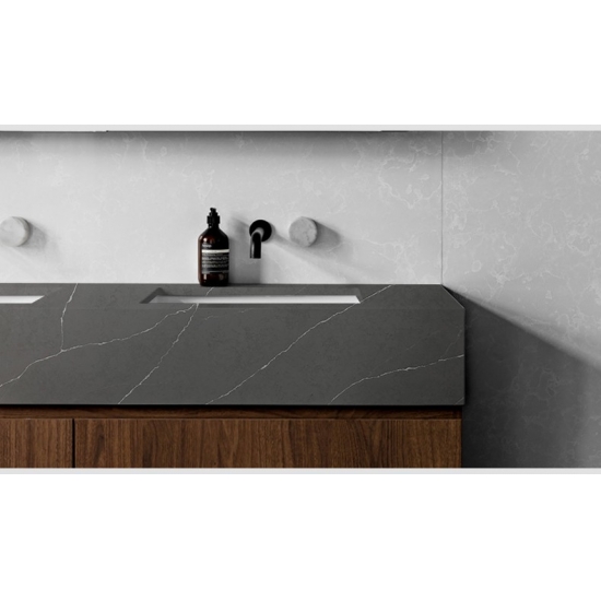 5032 テンパークォーツ スラブは、深みのあるチャコールグレーのベースに鮮やかなホワイトの縞模様がドラマチックに織り込まれ、大胆でダイナミックな印象を与えます。コントラストの強い模様は、力強いエネルギーとモダンなエッジを演出します。このスラブは力強い視覚効果を発揮し、現代的で個性的なインテリアに最適で、あらゆる空間にドラマチックな洗練された雰囲気を添えます。