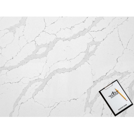 5044 Volakas ホワイトカラカッタクォーツは、時代を超越したエレガンスと汎用性の高いデザインにより、様々な用途に最適です。この研磨仕上げのクォーツは、キッチンカウンター、バスルームの洗面台、バックスプラッシュなどによく使用され、清潔感のある白い表面に柔らかなグレーの縞模様が洗練された雰囲気を添えます。また、住宅および商業施設の壁材や床材にも最適です。