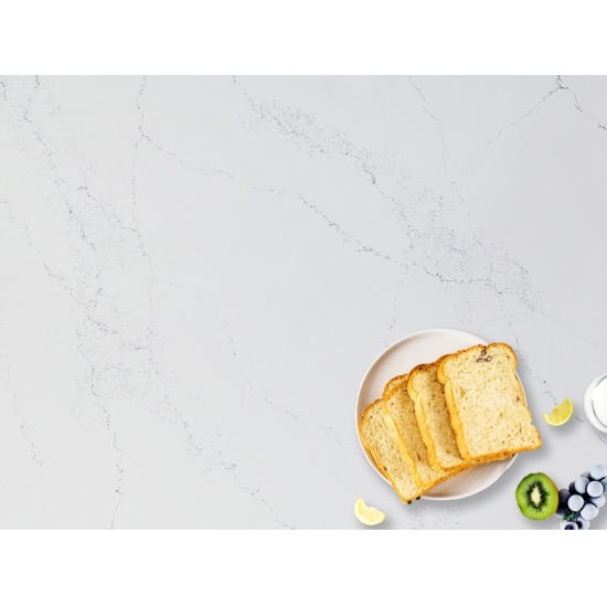 5044 Volakas ホワイトカラカッタクォーツは、時代を超越したエレガンスと汎用性の高いデザインにより、様々な用途に最適です。この研磨仕上げのクォーツは、キッチンカウンター、バスルームの洗面台、バックスプラッシュなどによく使用され、清潔感のある白い表面に柔らかなグレーの縞模様が洗練された雰囲気を添えます。また、住宅および商業施設の壁材や床材にも最適です。