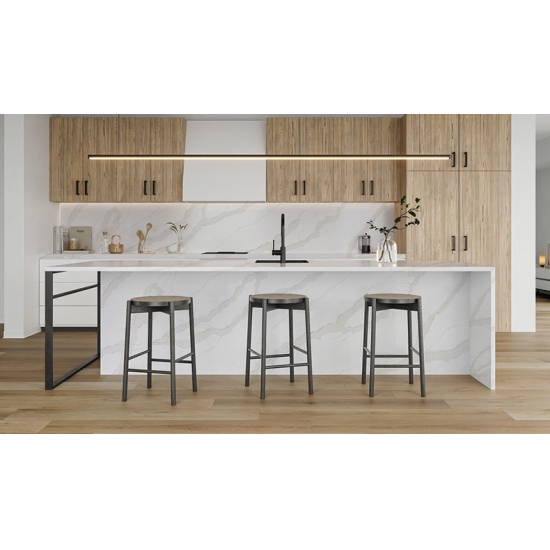 5059 カラカッタ パリ クォーツは、鮮やかなホワイトのベースに、大胆でドラマチックなグレーの縞模様が映えます。鮮やかなコントラストが、ダイナミックでラグジュアリーな視覚効果を生み出します。モダンなエレガンスを体現したこのスラブは、あらゆるインテリア空間に洗練された印象を与えます。