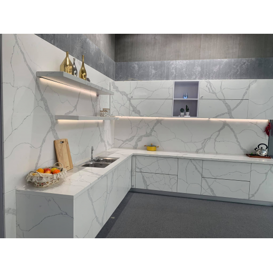 5044 Volakas ホワイトカラカッタクォーツは、時代を超越したエレガンスと汎用性の高いデザインにより、様々な用途に最適です。この研磨仕上げのクォーツは、キッチンカウンター、バスルームの洗面台、バックスプラッシュなどによく使用され、清潔感のある白い表面に柔らかなグレーの縞模様が洗練された雰囲気を添えます。また、住宅および商業施設の壁材や床材にも最適です。