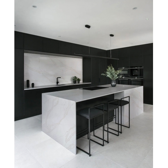 5063 ヴェローナ カラカッタ クォーツは、シリカを含まないクォーツとして、特にキッチンやバスルームなどの表面材として、より健康的で持続可能な選択肢を提供します。シリカを含まないため、施工時の安全性が高く、シリカ粉塵への曝露に伴う健康リスクを軽減します。優美なカラカッタ模様は、大理石のような高級感を醸し出すと同時に、耐久性に優れた無孔質の表面は、汚れ、傷、熱への耐性を備えています。そのため、美しさ、安全性、メンテナンスの容易さを兼ね備え、人通りの多い場所に最適な選択肢となります。