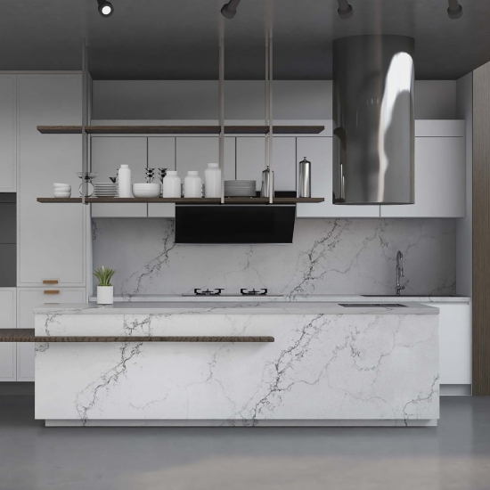 5044 Volakas ホワイトカラカッタクォーツは、時代を超越したエレガンスと汎用性の高いデザインにより、様々な用途に最適です。この研磨仕上げのクォーツは、キッチンカウンター、バスルームの洗面台、バックスプラッシュなどによく使用され、清潔感のある白い表面に柔らかなグレーの縞模様が洗練された雰囲気を添えます。また、住宅および商業施設の壁材や床材にも最適です。