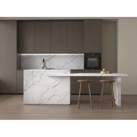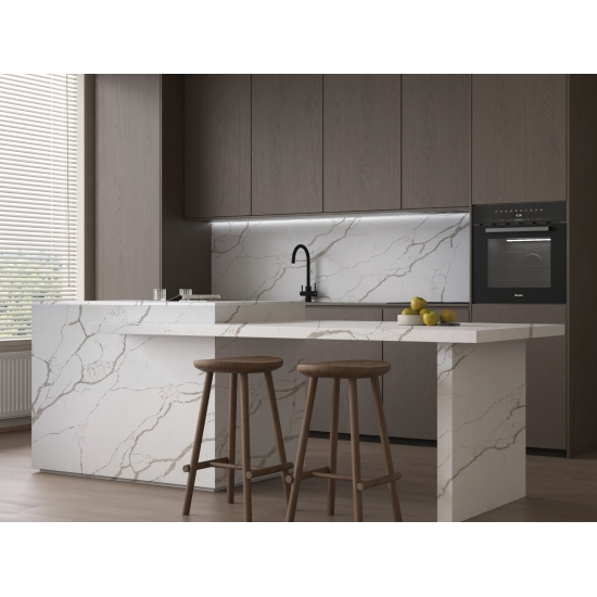5044 Volakas ホワイトカラカッタクォーツは、時代を超越したエレガンスと汎用性の高いデザインにより、様々な用途に最適です。この研磨仕上げのクォーツは、キッチンカウンター、バスルームの洗面台、バックスプラッシュなどによく使用され、清潔感のある白い表面に柔らかなグレーの縞模様が洗練された雰囲気を添えます。また、住宅および商業施設の壁材や床材にも最適です。