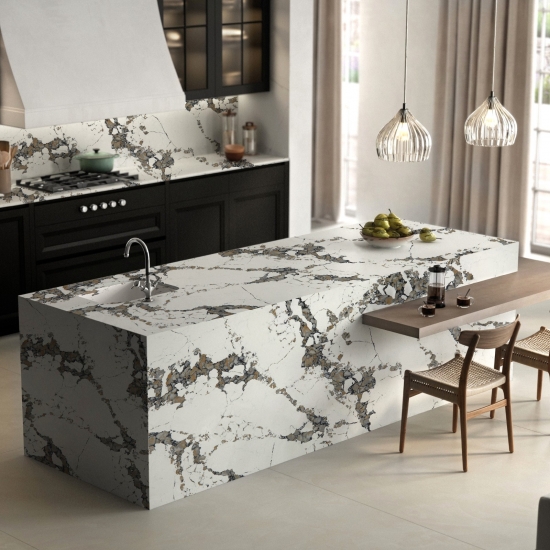 カラカッタシリーズのクォーツは、現在最も人気のあるクォーツストーン製品です。精巧でユニークなカラカッタクォーツは、その澄んだ白と、大理石のような印象的な縞模様が五感を魅了します。美しく印象的な幅広の縞模様と高級感のある質感が特徴です。カラカッタ大理石の自然な外観を保ちながら、大理石のワークトップにありがちな欠点は一切ありません。カラカッタクォーツは、汚れや傷に強い耐久性の高いワークトップです。キッチンやバスルームのカウンタートップ、階段、窓枠、カスタム家具、内装、外壁、床、ウォータージェット模様、その他のデザインプロジェクトなど、実用性も兼ね備えています。