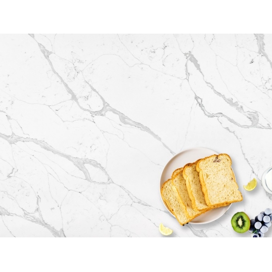 5044 Volakas ホワイトカラカッタクォーツは、時代を超越したエレガンスと汎用性の高いデザインにより、様々な用途に最適です。この研磨仕上げのクォーツは、キッチンカウンター、バスルームの洗面台、バックスプラッシュなどによく使用され、清潔感のある白い表面に柔らかなグレーの縞模様が洗練された雰囲気を添えます。また、住宅および商業施設の壁材や床材にも最適です。