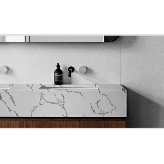 5077 カラカッタ・ヴァグリ クォーツ スラブは、鮮やかなホワイトのベースに、深みのあるドラマチックなグレーの縞模様が大胆に織り込まれています。鮮やかなコントラストが、力強い奥行き感とダイナミックな動きを生み出します。モダンなラグジュアリーを体現したこのスラブは、あらゆる現代的なインテリアの魅力的なフォーカルポイントとして最適です。