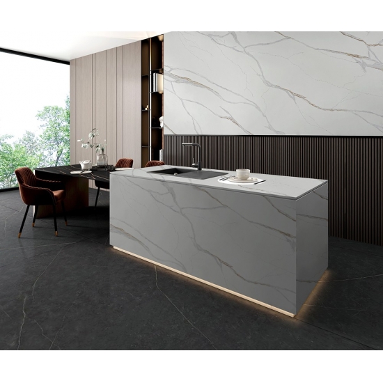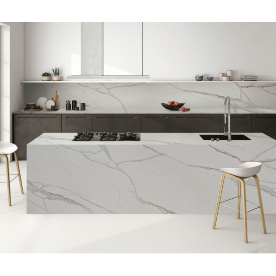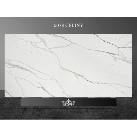 比類なき美しさを誇るCelinyクォーツカウンタートップSL abホワイトにゴールドテクスチャーをあしらいました。この優美なスラブは、荘厳なホワイトを背景に、繊細なゴールドテクスチャーが美しく織り交ぜられ、ご自宅のインテリアに高級感と洗練された雰囲気を添えます。高品質の素材と革新的な技術を駆使して作られたこの多用途なカウンタートップは、キッチンやバスルームをスタイリッシュで快適な空間へと変貌させるのに最適です。