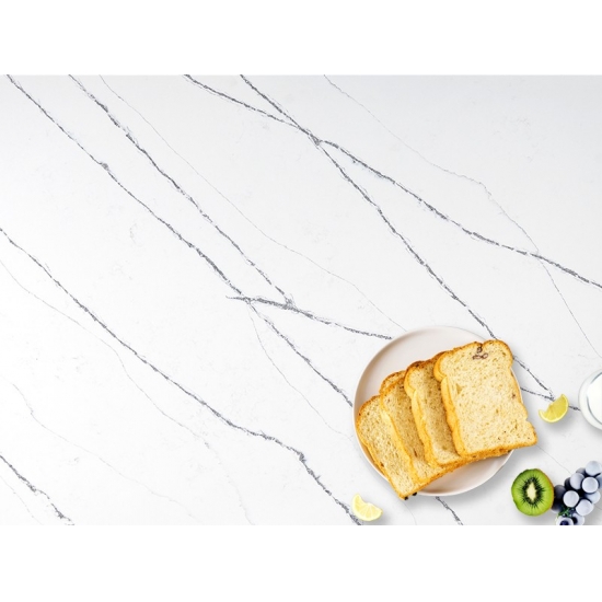 5044 Volakas ホワイトカラカッタクォーツは、時代を超越したエレガンスと汎用性の高いデザインにより、様々な用途に最適です。この研磨仕上げのクォーツは、キッチンカウンター、バスルームの洗面台、バックスプラッシュなどによく使用され、清潔感のある白い表面に柔らかなグレーの縞模様が洗練された雰囲気を添えます。また、住宅および商業施設の壁材や床材にも最適です。