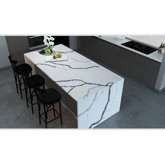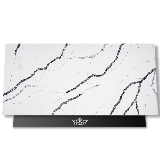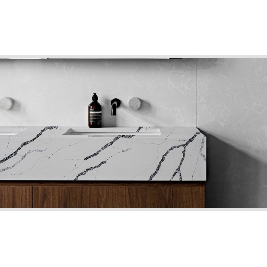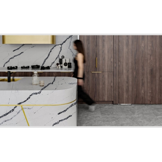 5083 カラカッタ・ベラ・クォーツは、鮮やかなホワイトのベースに、印象的な大胆なグレーの縞模様が織りなす美しい石です。ドラマチックなコントラストが、力強い奥行きと動きを生み出します。このスラブは、ラグジュアリーなエレガンスを体現し、あらゆる現代的なインテリアに洗練された印象を与えます。