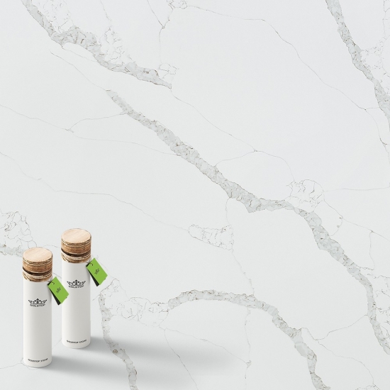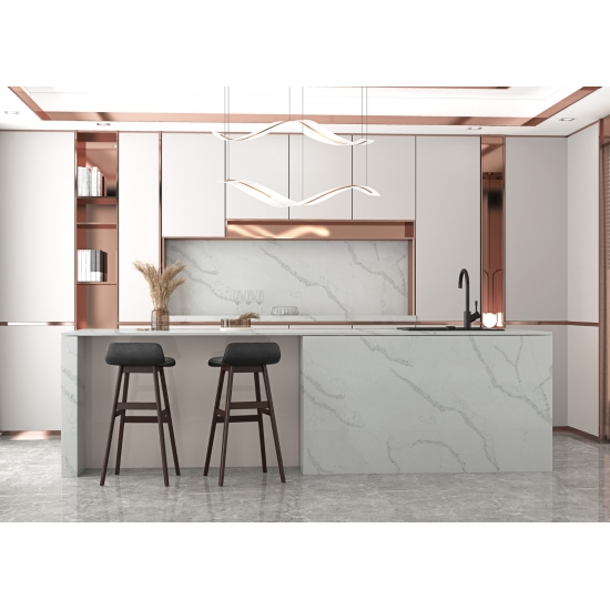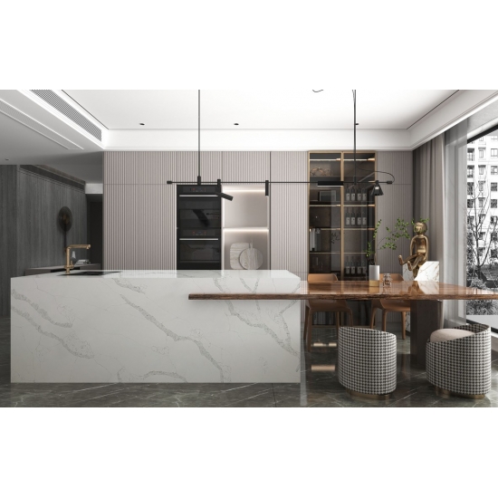 カラカッタシリーズのクォーツは、現在最も人気のあるクォーツストーン製品です。精巧でユニークなカラカッタクォーツは、その澄んだ白と、大理石のような印象的な縞模様が五感を魅了します。美しく印象的な幅広の縞模様と高級感のある質感が特徴です。カラカッタ大理石の自然な外観を保ちながら、大理石のワークトップにありがちな欠点は一切ありません。カラカッタクォーツは、汚れや傷に強い耐久性の高いワークトップです。キッチンやバスルームのカウンタートップ、階段、窓枠、カスタム家具、内装、外壁、床、ウォータージェット模様、その他のデザインプロジェクトなど、実用性も兼ね備えています。