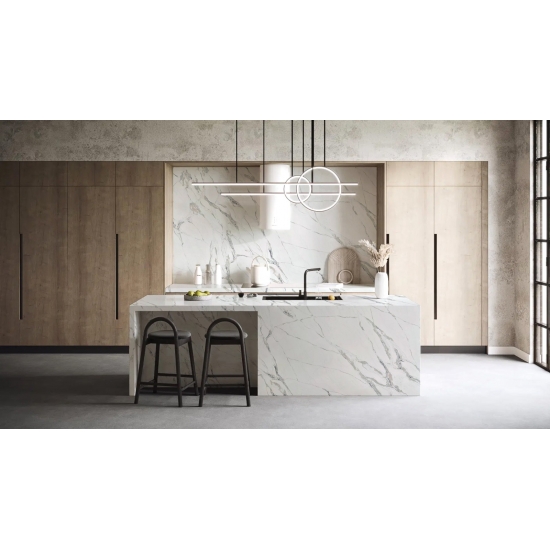 カラカッタシリーズのクォーツは、現在最も人気のあるクォーツストーン製品です。精巧でユニークなカラカッタクォーツは、その澄んだ白と、大理石のような印象的な縞模様が五感を魅了します。美しく印象的な幅広の縞模様と高級感のある質感が特徴です。カラカッタ大理石の自然な外観を保ちながら、大理石のワークトップにありがちな欠点は一切ありません。カラカッタクォーツは、汚れや傷に強い耐久性の高いワークトップです。キッチンやバスルームのカウンタートップ、階段、窓枠、カスタム家具、内装、外壁、床、ウォータージェット模様、その他のデザインプロジェクトなど、実用性も兼ね備えています。