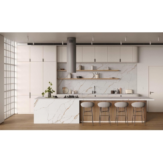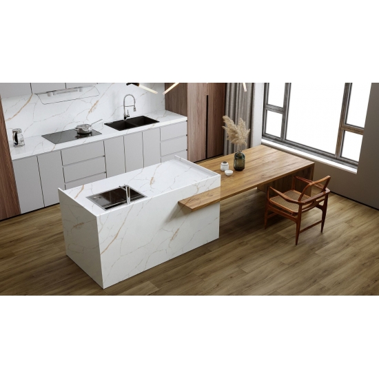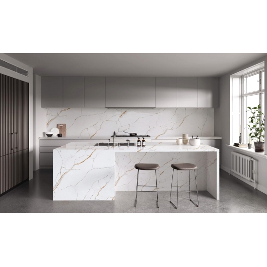 カラカッタシリーズのクォーツは、現在最も人気のあるクォーツストーン製品です。精巧でユニークなカラカッタクォーツは、その澄んだ白と、大理石のような印象的な縞模様が五感を魅了します。美しく印象的な幅広の縞模様と高級感のある質感が特徴です。カラカッタ大理石の自然な外観を保ちながら、大理石のワークトップにありがちな欠点は一切ありません。カラカッタクォーツは、汚れや傷に強い耐久性の高いワークトップです。キッチンやバスルームのカウンタートップ、階段、窓枠、カスタム家具、内装、外壁、床、ウォータージェット模様、その他のデザインプロジェクトなど、実用性も兼ね備えています。