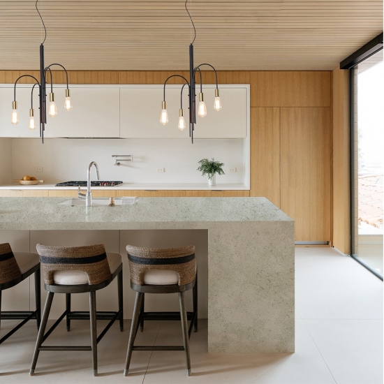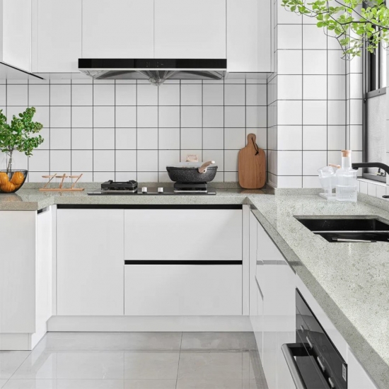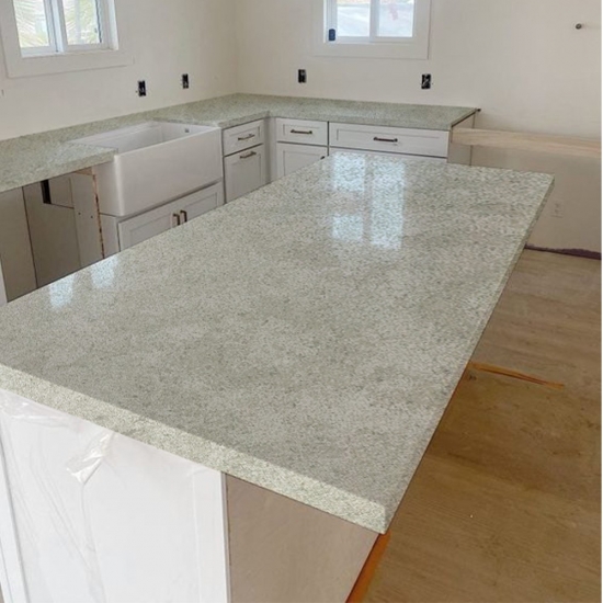 セメントホワイトクォーツ スノーフレークテクスチャークォーツは、特殊加工された人工石クォーツ素材です。マット仕上げに似たコンクリート仕上げは、従来のポリッシュ仕上げに比べてクォーツの色がわずかに変化します。この仕上げは、花崗岩では「ブラッシュ仕上げ」とも呼ばれます。