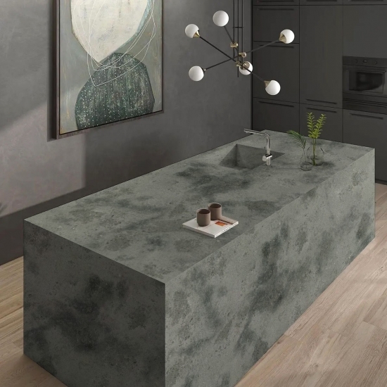 コンクリートクォーツは、特殊加工された人工石クォーツ素材です。マット仕上げに似たコンクリート仕上げは、従来のポリッシュ仕上げに比べてクォーツの色がわずかに変化します。この仕上げは、花崗岩の場合、「ブラッシュ仕上げ」とも呼ばれます。