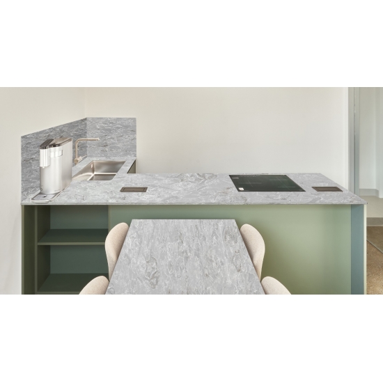 6004 ホライゾングレー コンクリートクォーツ コンクリートクォーツは、特殊加工された人工石クォーツ素材です。マット仕上げに似たコンクリート仕上げは、従来のポリッシュ仕上げに比べてクォーツの色がわずかに変化します。この仕上げは、花崗岩の場合、「ブラッシュ仕上げ」とも呼ばれます。