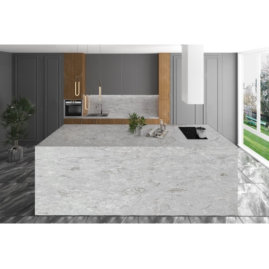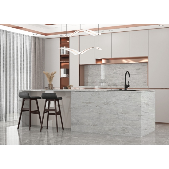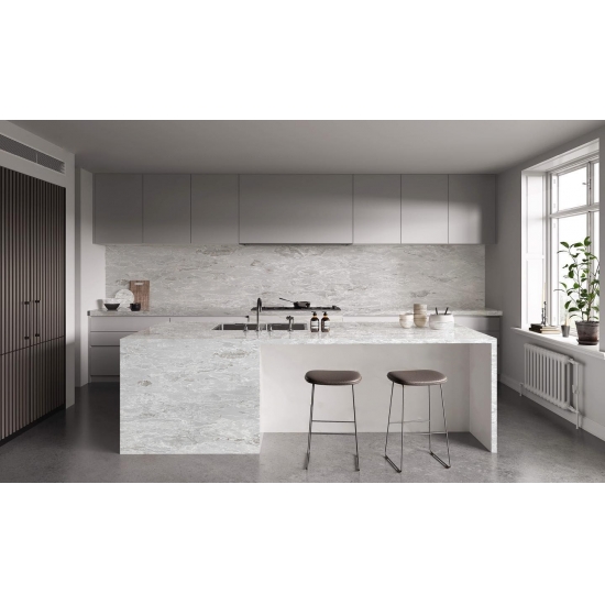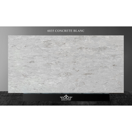 6035 コンクリート ブランは、コンクリートのような質感を持ちながらも、より洗練された滑らかな表面を持つ、モダンな魅力を持つ石材です。鮮やかな白にほのかなグレーの色合いが加わり、清潔感と洗練された印象を与えます。この石材は、特にキッチンやバスルームなど、現代的なインテリアに最適で、あらゆる空間に洗練されたスタイリッシュな雰囲気を添えます。