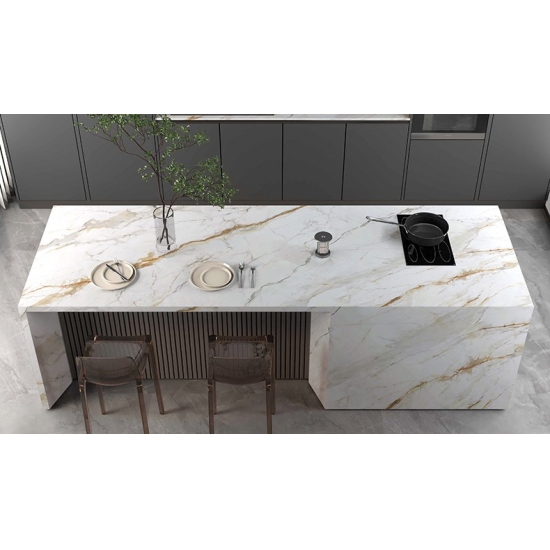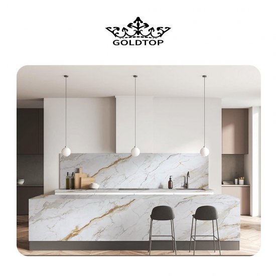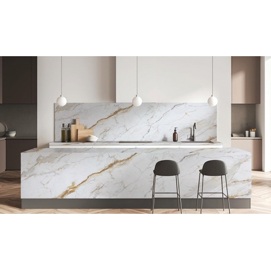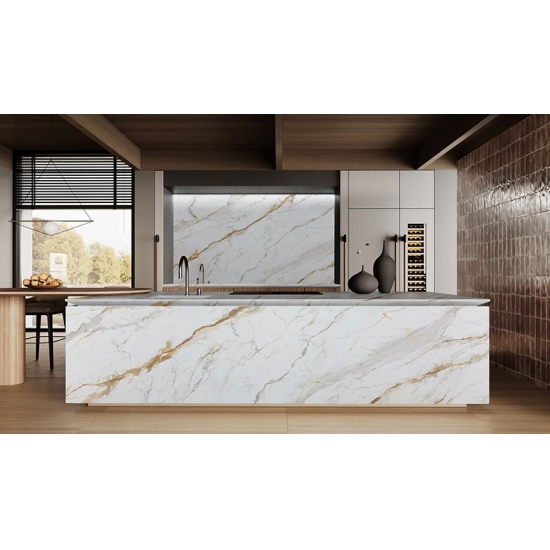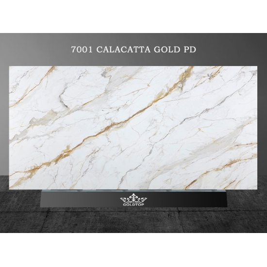 時代を超えた贅沢を体験してください 7001 カラカッタ ゴールド 磁器板 この優美なスラブは、天然のカラカッタ大理石のエッセンスを見事に捉えています。輝くような白を背景に、ゴールドと繊細なグレーの曲線が優雅に織り込まれています。大判のデザインと卓越した耐久性により、カウンタートップ、壁、床にシームレスで豪華な印象を与え、あらゆる空間を洗練されたエレガンスの傑作へと変貌させます。