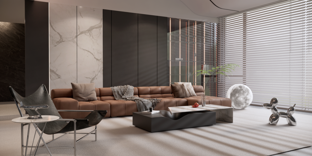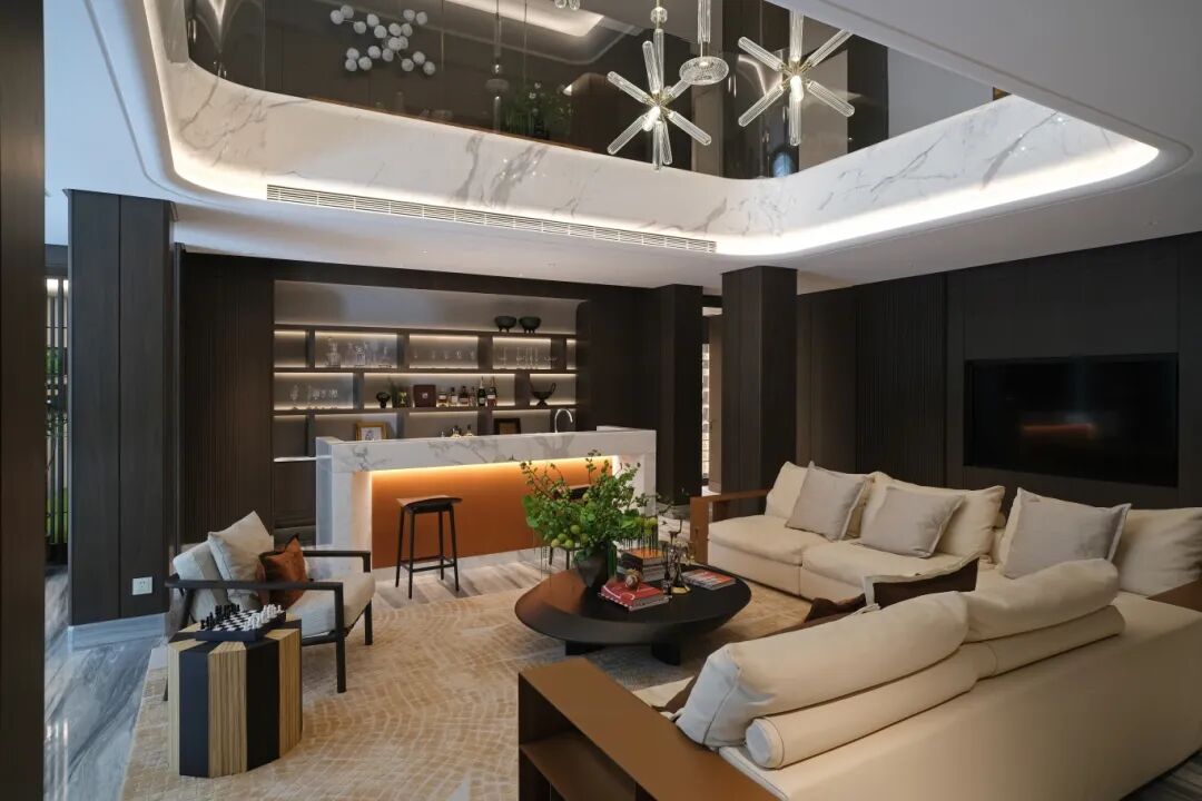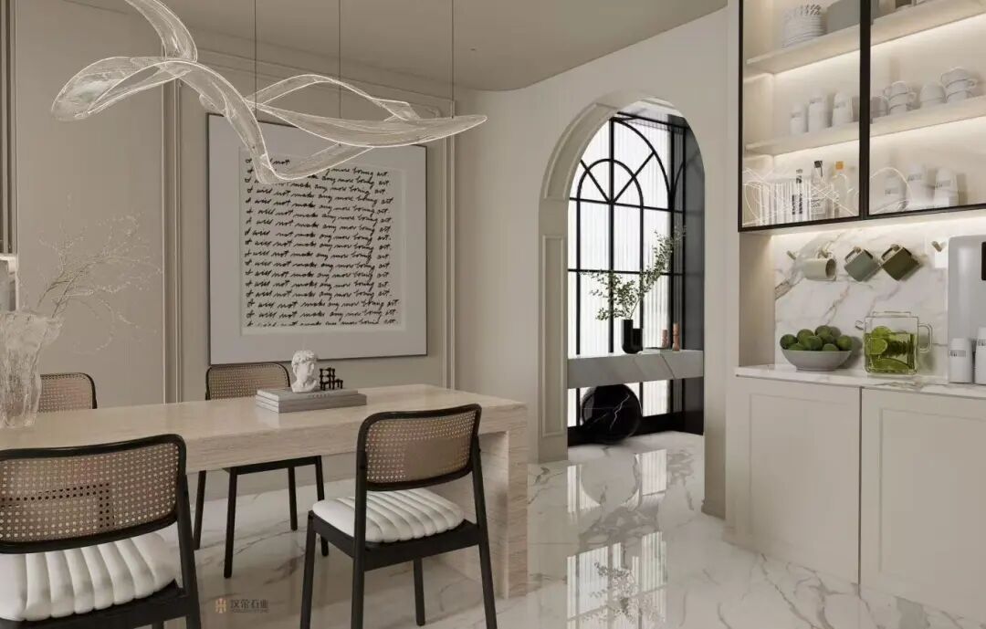個人住宅では、カラカッタホワイトがより親密な雰囲気を醸し出します。杭州プライベートレジデンス011では、カラカッタホワイトが室内空間と庭園の景観を繋ぐ静謐な背景として機能しています。温かみのあるホワイトトーンと繊細なベールが、贅沢でありながら自然に根ざした、安らぎのあるリビング空間を創り出しています。