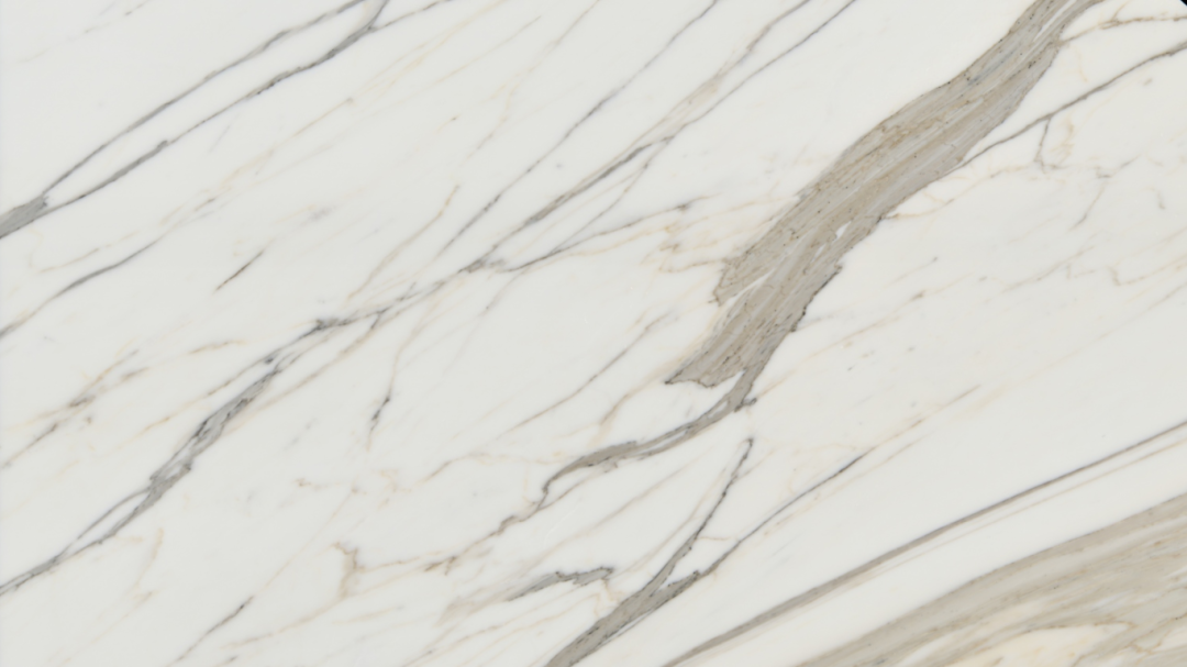 カラカッタホワイトは、夜明けの光を石に閉じ込めたかのようです。ベースは乳白色と淡いグレーが柔らかく溶け合い、上質な翡翠のように純粋で輝く色彩を放ちます。表面はシルクのような柔らかな光沢を放ち、繊細なグレーの筋がまるで自然の筆致のように描かれています。清らかな背景と芸術的なベールの調和が、ミニマルなインテリアにも、表現力豊かな空間にも、無限の汎用性をもたらします。