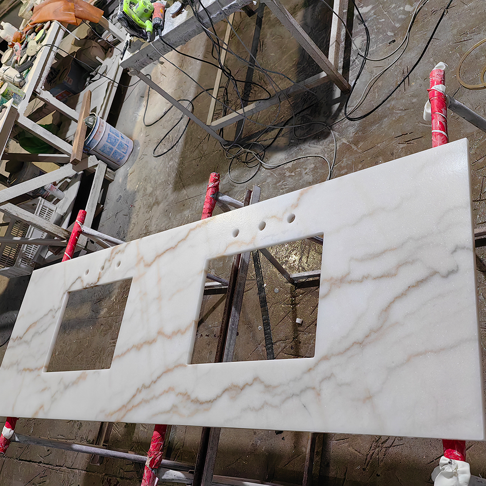 Polished,Honed,Flamed,Leatherデュアルシンク設計を特徴とするこのカウンタートップは、バスルーム、化粧台エリア、さらには高級ホテルのプロジェクトでの実用的な使用に合わせて調整されています。精密にカットされたシンクの開口部と事前に開けられた蛇口の穴は熟練の職人技を際立たせており、配管器具とのシームレスな統合を保証します。